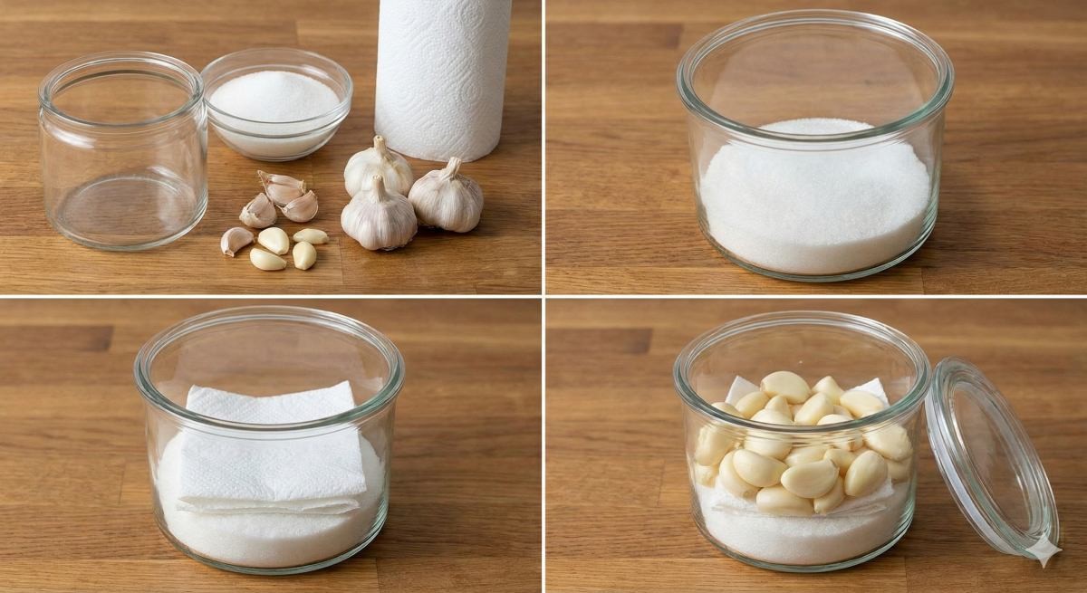 마늘을 신선하게 보관하기 위해서는 몇 가지 준비물과 정확한 순서가 필요하다. 준비물은 뚜껑이 있는 밀폐용기, 설탕, 키친타월이다.