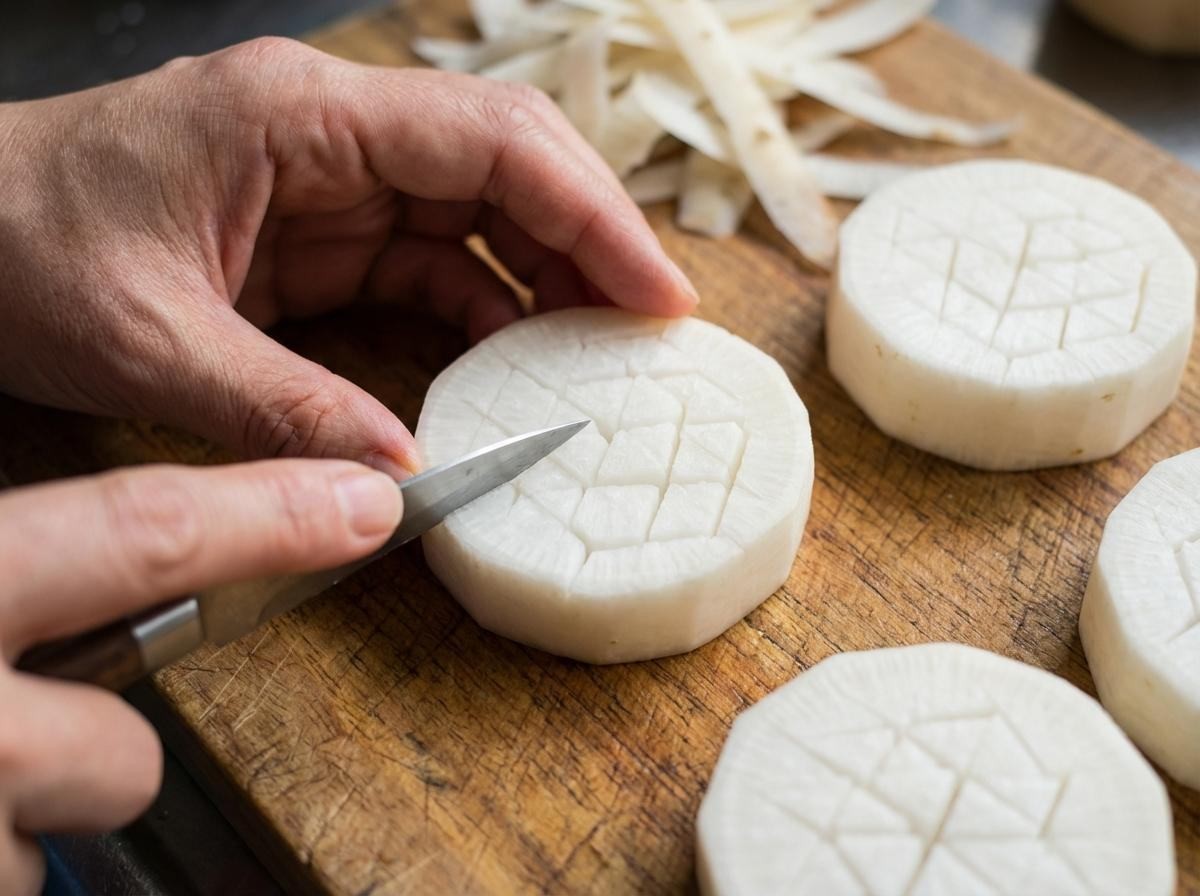 무 스테이크는 손질에서 결과가 갈린다. 무는 껍질을 벗기고 약 1.5cm 두께로 써는 것이 적당하다. 너무 얇으면 식감이 무너지고, 두꺼우면 속까지 익는 데 시간이 오래 걸린다. 썬 무의 양면에는 벌집 삼겹살처럼 칼집을 촘촘히 낸다. 이 과정 덕분에 열이 고르게 전달되고, 이후 더하는 재료의 풍미가 속까지 스며든다.
