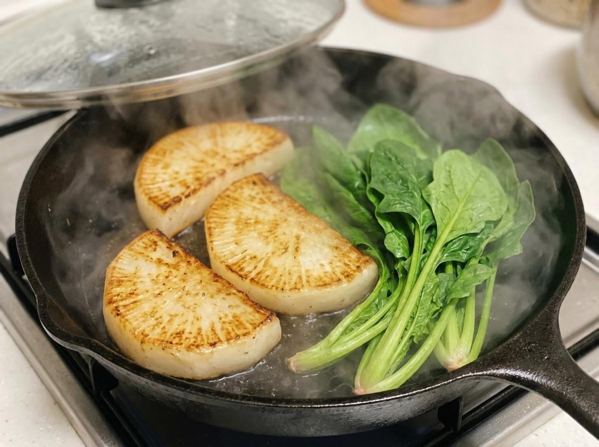 무가 어느 정도 구워지면 섬초를 팬에 올린다. 불을 줄이고 레몬즙과 물을 소량 넣은 뒤 뚜껑을 덮어 김으로 익힌다. 끓이듯 조리하지 않고 수증기로 마무리하는 방식이다. 이 과정에서 무는 겉은 부드럽고 속은 아삭한 식감을 유지한다.