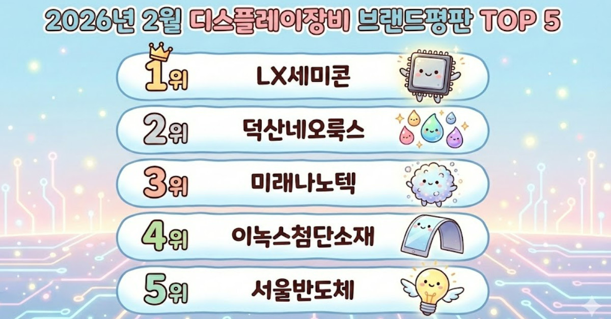 2026년 2월 디스플레이장비 상장기업 브랜드평판 빅데이터 분석 결과 LX세미콘이 1위에 올랐으며 덕산네오룩스와 미래나노텍이 그 뒤를 이어 최상위권을 형성했다. 한국기업평판연구소는 지난 한 달간 56개 브랜드에 대한 1398만 1457개의 빅데이터를 분석하여 소비자의 브랜드 소비 습관과 긍부정 평가, 미디어 관심도 및 시장 가치 등을 종합적으로 측정해 이 같은 순위를 도출했다.