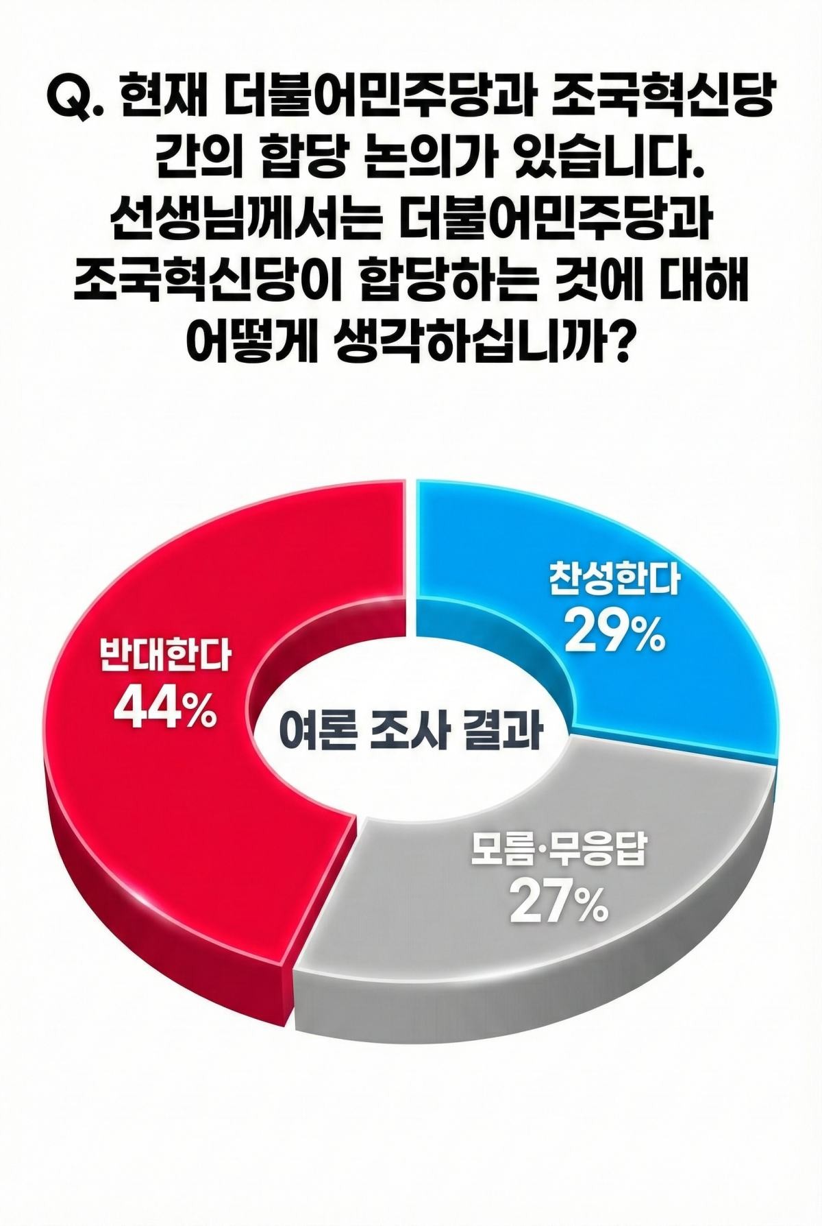 더불어민주당과 조국혁신당의 합당 이슈가 연일 논란인 가운데 여론조사 결과가 하나 공개돼 주목받고 있다.