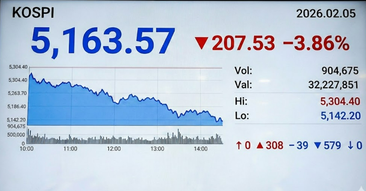 2026년 2월 5일 코스피가 외국인과 기관의 동반 매도세에 밀려 3% 넘게 급락하며 5100선 중반으로 후퇴했다. 이날 코스피 지수는 전 거래일 대비 207.53포인트(3.86%) 하락한 5163.57로 장을 마쳤다. 장중 한때 5142.20까지 밀리며 변동성을 키웠으나 개인 투자자의 대규모 매수세가 유입되며 낙폭을 일부 만회했다. 이날 거래량은 9억 467만 5000주, 거래대금은 32조 2278억 원을 기록했다.