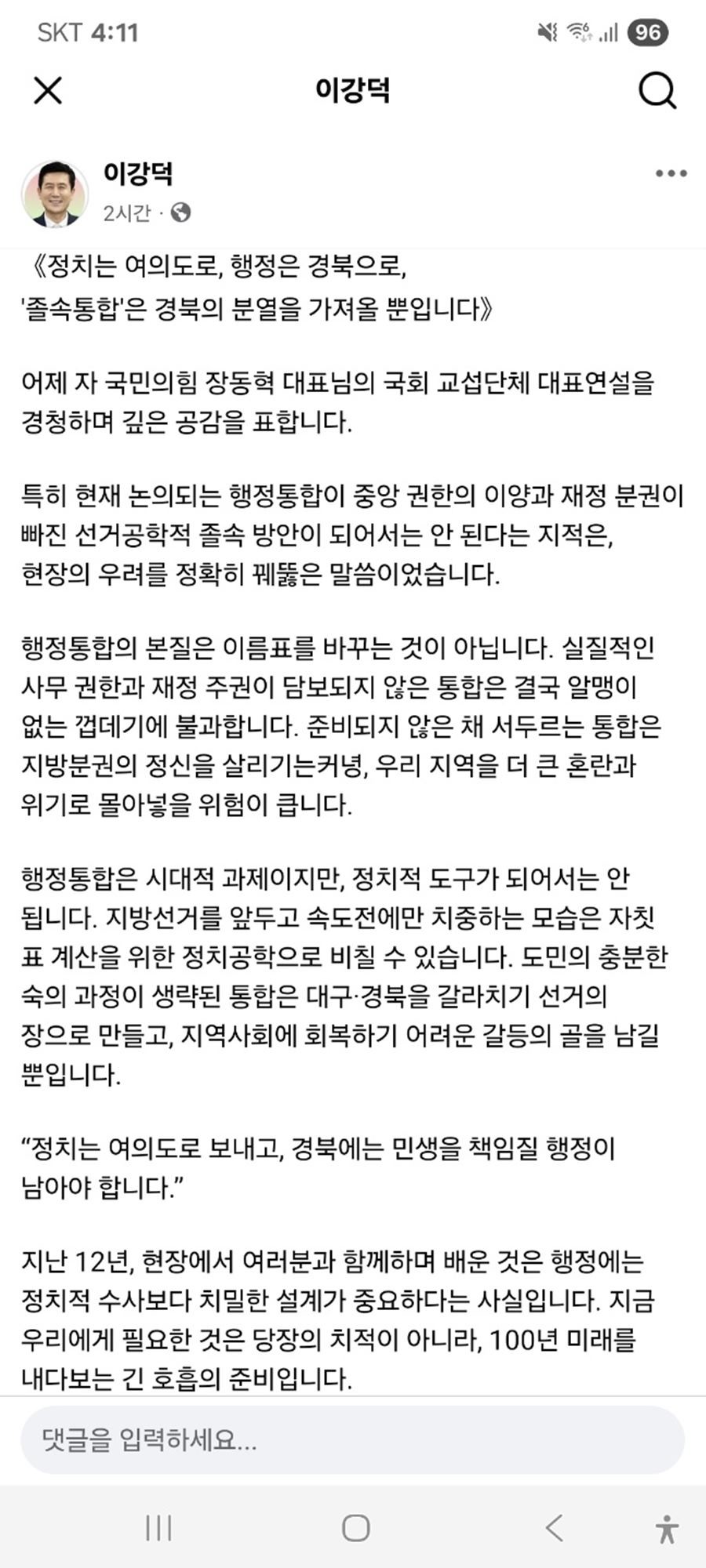 이강덕 시장은 5일 자신의 페이스북을 통해, “도민의 충분한 숙의 과정이 생략된 통합은 대구·경북을 갈라치기 선거의 장으로 만들고 지역사회에 회복하기 어려운 갈등의 골을 남길 뿐이다”고 전제한 뒤, “정치는 여의도로 보내고, 경북에는 민생을 책임질 행정이 남아야 한다”고 강조하며, "지금 우리에게 필요한 것은 당장의 치적이 아닌 100년 미래를 내다보는 긴 호흡의 시간을 갖고 도민의 목소리가 담긴 현실적인 대안을 원점에서부터 다시 찾아야 한다”고 촉구했다.