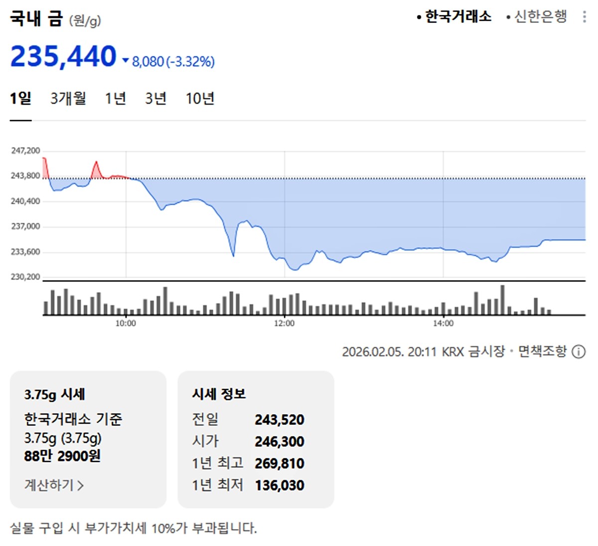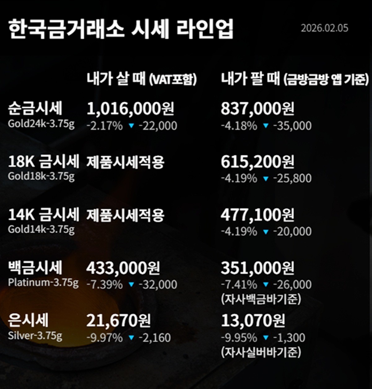 국내 금시세(금값)가 5일(한국 시각) 오후 하락세(전 거래일 대비)로 마감했다.