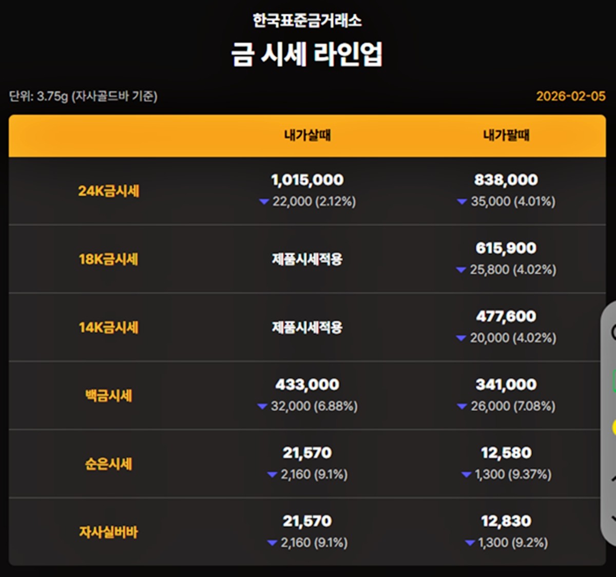 대한민국 자본시장을 종합적으로 관장하는 한국거래소 기준 이날 오후 금가격은 다음과 같다.