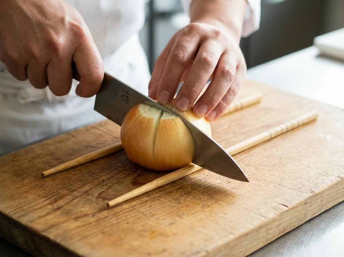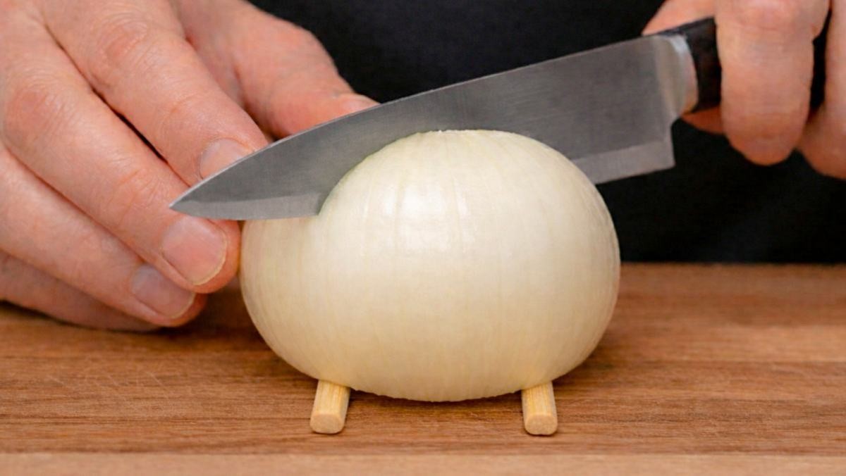 가장 중요한 첫 단계는 칼질이다. 양파 밑동에 나무젓가락 두 개를 나란히 놓고 그 위에 양파를 올린 뒤 칼을 내리면, 칼날이 끝까지 내려가지 않는다. 이 방식 덕분에 양파가 완전히 쪼개지지 않고 꽃잎처럼 연결된 상태를 유지한다. 보통 16등분 정도로 칼집을 내면 모양이 예쁘게 잡힌다. 처음 해보는 사람도 나무젓가락을 받침대로 쓰면 과하게 자를 위험이 줄어든다.