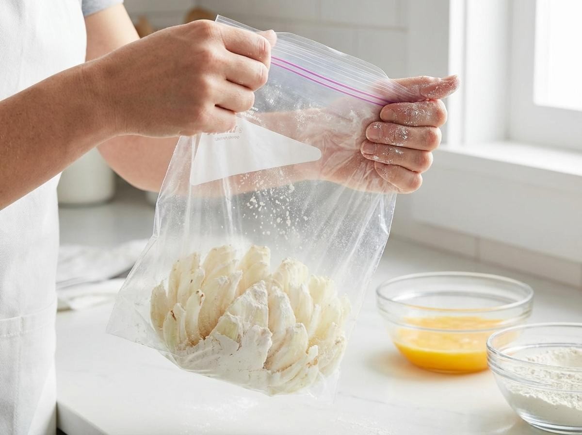 튀김옷을 입히는 과정도 설거지를 최소화하는 방식으로 정리했다. 위생 비닐봉지에 튀김가루를 넣고 양파를 통째로 넣어 흔들면 가루가 고르게 묻는다. 그다음 달걀물을 묻힌 뒤 다시 한 번 가루나 빵가루를 입히면 된다. 손에 반죽이 묻지 않아 깔끔하고, 꽃잎 사이사이에도 가루가 비교적 균일하게 들어간다.