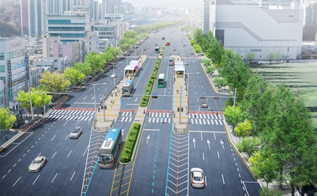 가장 큰 변화는 도로 중앙에 버스만 다닐 수 있는 ‘전용차로’가 생긴다는 점이다. 막히는 승용차들 사이에서 버스가 가다 서기를 반복하던 모습이 사라지게 된다. 정류장 역시 도로 중앙에 33곳(기존 가로변 활용 8곳 포함 총 41곳)이 설치돼 지하철 승강장처럼 편리하게 이용할 수 있다.