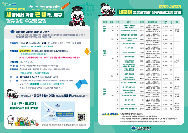 [위키트리 광주전남취재본부 노해섭 기자] 광주광역시 서구(구청장 김이강)는 ‘세상에서 가장 큰 대학, 서구(이하 세큰대)’ 상반기 정규강좌 수강생을 모집한다.