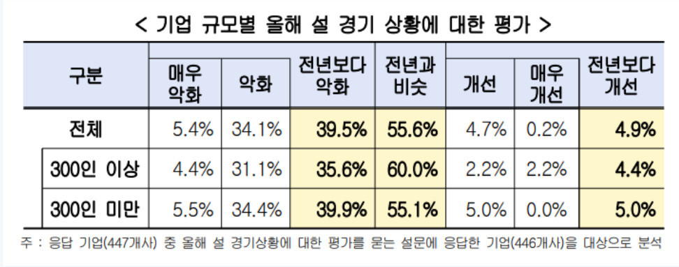 경영 현장에서 느끼는 설 경기 상황은 지난해보다 크게 개선된 양상을 띠고 있다. 올해 설 경기가 전년보다 악화됐다고 답한 기업은 39.5%로 나타났는데 이는 최근 5년 중 가장 높은 수치를 기록했던 지난해의 60.5%와 비교하면 21.0%포인트 급감한 수치다. 경기가 전년과 비슷한 수준이라는 응답은 55.6%로 과반을 차지했다. 다만 경기 악화를 호소하는 비중은 300인 미만 기업에서 39.9%로 나타나 대규모 기업의 35.6%보다 다소 높게 측정되며 중소업계의 경영난이 상대적으로 지속되고 있음을 시사했다.