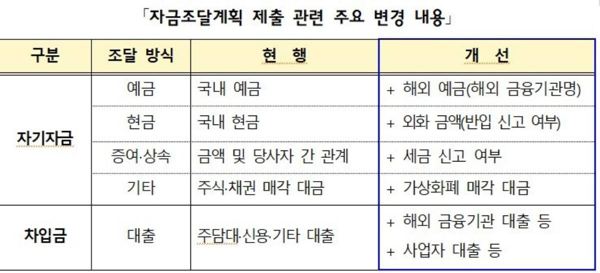 자금조달계획 신고 내용에는 해외 자금 조달 내역이 추가됐다. 해외 예금과 해외 대출은 물론 해당 해외금융기관명을 명시해야 한다. 기타 자금 항목에는 기존 주식 및 채권 매각대금 외에도 가상화폐 매각대금이 새롭게 포함돼 자금 출처를 밝혀야 한다.