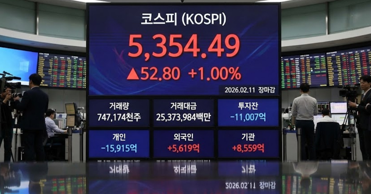 코스피 지수가 2026년 2월 11일 외국인과 기관의 강력한 동반 매수세에 힘입어 전 거래일 대비 52.80포인트 상승한 5354.49로 장을 마감하며 대형주 중심의 견조한 상승 동력을 확인했다. 개인 투자자들이 1조 5000억 원이 넘는 대규모 차익 실현 물량을 쏟아냈음에도 불구하고 자동차와 반도체 업종으로 유입된 기관의 자금이 지수를 1%대 상승으로 이끌었다.