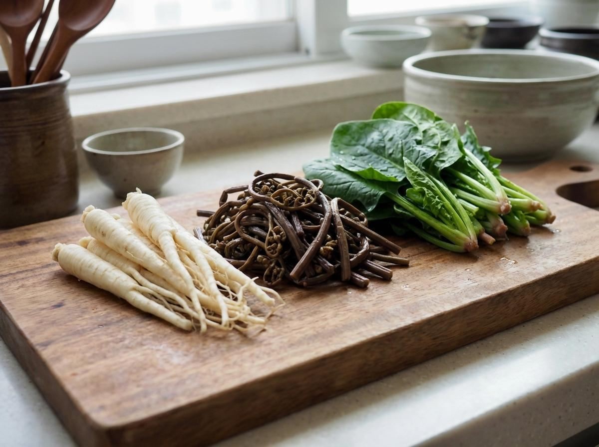 전통적으로는 뿌리채소, 줄기채소, 잎채소를 각각 하나씩 골라 올린다. 도라지나 무나물 같은 흰색 계열의 뿌리채소, 고사리처럼 갈색을 띠는 줄기채소, 시금치나 미나리 같은 초록 잎채소가 대표적이다. 이 조합은 우연이 아니라 구조적인 상징을 따른다.