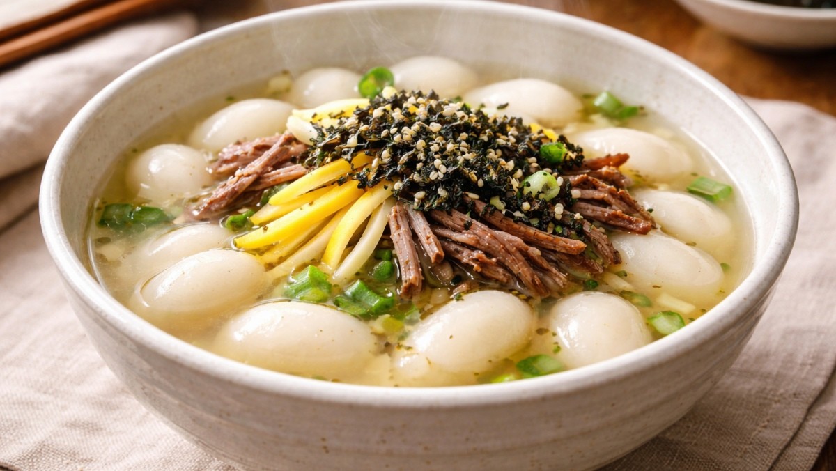 떡을 구우면 겉은 바삭하고 속은 쫄깃해지며 국물에 구운 기름의 고소한 향이 배어들어 일반 떡국과는 다른 풍미를 낸다. '꾸븐 떡국'이라고도 불리며, 떡의 겉면이 국물에 풀어지지 않아 국물이 깔끔하고 떡 자체의 씹는 맛이 살아있다.