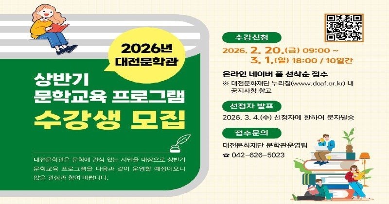 [위키트리 대전=김지연 기자] 대전문화재단이 운영하는 대전문학관이 '2026 상반기 문학교육프로그램' 수강생을 모집한다.