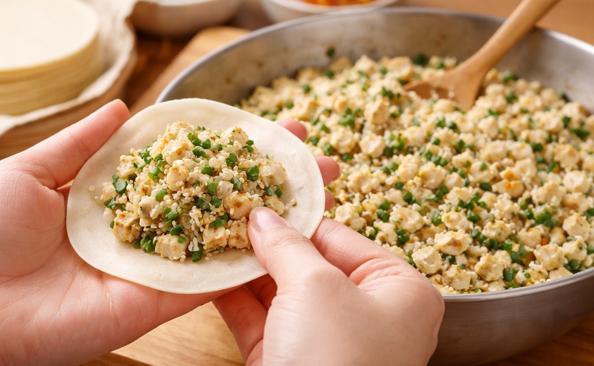 먼저 만두소를 준비한다. 두부는 단단한 부침용 두부를 사용하는 것이 좋으며 면포에 싸서 물기를 충분히 짜는 과정이 가장 중요하다. 물기가 남아 있으면 만두소가 질어지고 만두피가 쉽게 터질 수 있기 때문이다.