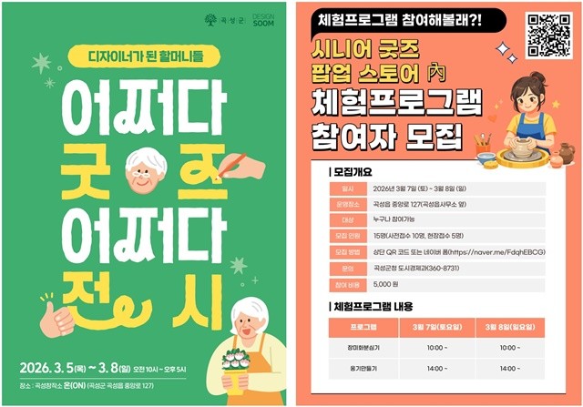 [위키트리 광주전남취재본부 노해섭 기자] 곡성군이 오는 3월 5일부터 8일까지 곡성읍 행정복지센터 옆 곡성창작소 온(ON)에서 ‘시니어 굿즈 팝업스토어’를 운영한다.