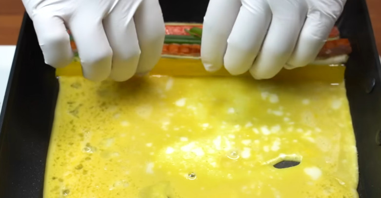 그다음 계란을 풀어 계란물을 준비한다. 소금은 아주 약간만 넣는다. 햄과 단무지에 이미 간이 되어 있기 때문에 과한 간은 피하는 게 좋다. 전분을 묻힌 재료를 계란물에 담갔다가 바로 팬으로 옮긴다.