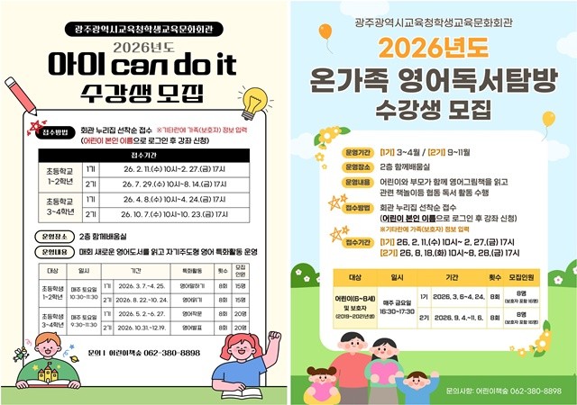 [위키트리 광주전남취재본부 노해섭 기자] 광주시교육청학생교육문화회관(이하 학생교육문화회관)이 오는 3월부터 영어 독서 프로그램 ‘아이 can do it’, ‘온가족 영어독서탐방’을 운영한다.