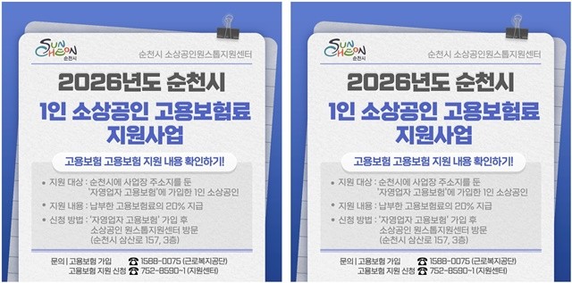 [위키트리 광주전남취재본부 노해섭 기자]순천시(시장 노관규)는 지역 내 1인 소상공인의 경영안정과 사회안전망 강화를 위해 ‘2026년 1인 소상공인 고용보험료 지원사업’을 19일부터 본격 시행한다고 밝혔다.