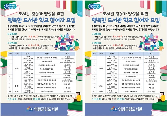 [위키트리 광주전남취재본부 노해섭 기자]영광군은 지역 독서문화 활성화와 군민 참여형 도서관 운영 기반을 마련하기 위해 「행복한 도서관 학교」 참여자를 모집한다고 밝혔다.