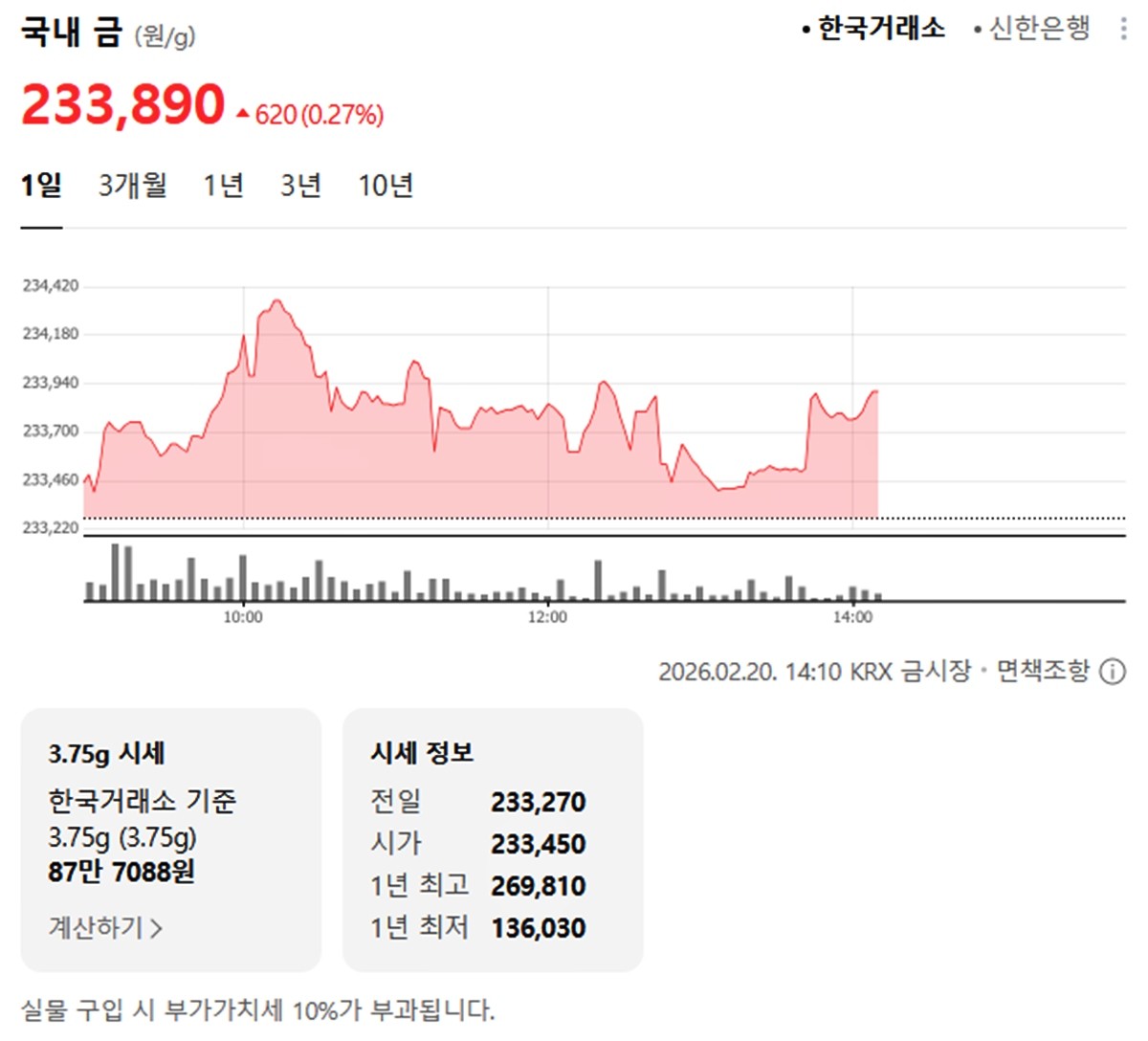 국내 금시세(금값)가 20일(이하 한국 시각) 오후 상승세(전 거래일 대비)로 마감했다.