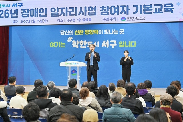 [위키트리 광주전남취재본부 노해섭 기자] 광주광역시 서구(구청장 김이강)가 장애인의 사회참여 확대와 자립기반 강화를 위한 ‘2026년 장애인일자리사업’을 추진한다. 서구는 25일 서구청 들불홀에서 장애인일자리사업 참여자 160여 명을 대상으로 안전보건 및 직무 소양 교육을 실시했다. 이번 교육은 참여자들의 직무 이해도를 높이고 산업재해를 예방하기 위해 마련됐다.