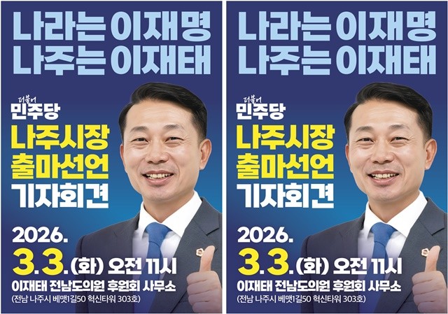 [위키트리 광주전남취재본부 노해섭 기자] 더불어민주당 이재태 전남도의원(나주3)이 오는 3월 3일 나주시장 출마를 공식 선언하고 본격적인 선거 행보에 나선다.