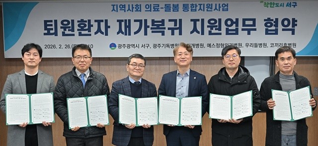 서구는 26일 서구보건소 보건교육장에서 광주기독·무지개·예스정형외과·우리들·코끼리휴병원 등 의료기관 5곳과 ‘퇴원환자 재가복귀 지원을 위한 업무협약’을 체결했다. 이번 협약으로 협력 의료기관은 총 19곳으로 확대됐다.