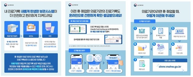 휴·폐업 의료기관의 진료기록부 이관 절차는 ▲관할 보건소에 휴폐업 신청서 제출 ▲진료기록발급포털 이관 신청 ▲ 진료기록부 이관 ▲ 보건소 최종 승인 순으로 진행된다.
