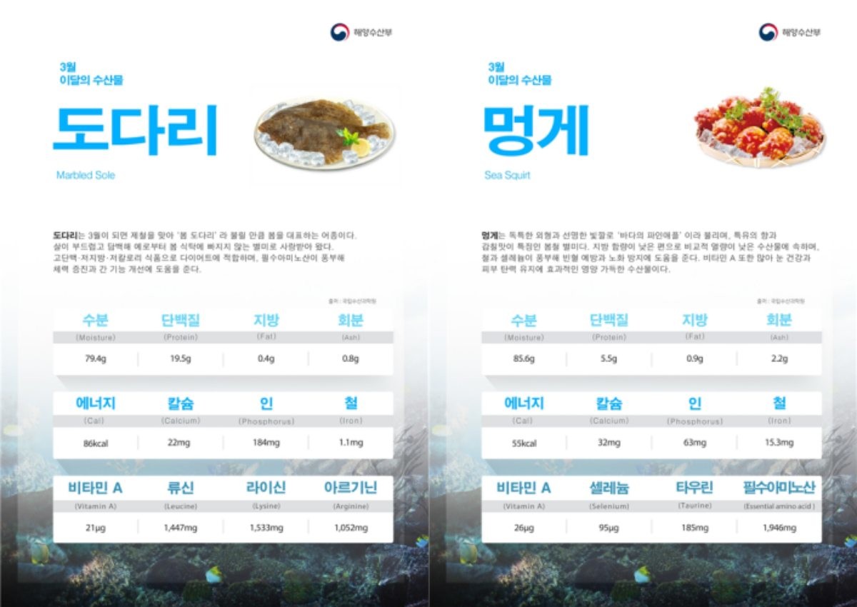 봄기운이 오르는 3월, 바다에서도 제철 식재료가 이름을 올렸다. 해양수산부가 선정한 이달의 수산물은 도다리와 멍게다. 봄철 식탁에 빠지지 않는 대표 별미가 공식적으로 ‘3월의 얼굴’로 꼽힌 셈이다. 이 밖에도 해양수산부는 3월을 맞아 어촌여행지, 해양생물, 등대, 무인도서를 각각 선정해 발표했다.