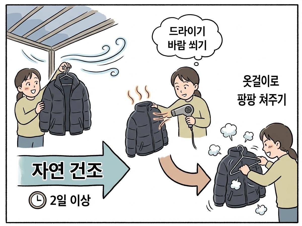 건조기가 없는 환경에서도 방법은 있다. 통풍이 잘되는 곳에서 2일 이상 자연 건조를 통해 속까지 바짝 말려주는 것이 우선이다. 이후 헤어드라이어의 바람을 쐬어주면서 옷걸이 등으로 패딩을 팡팡 두드려주면 충전재 사이에 공기층이 형성되어 볼륨감을 복원할 수 있다.