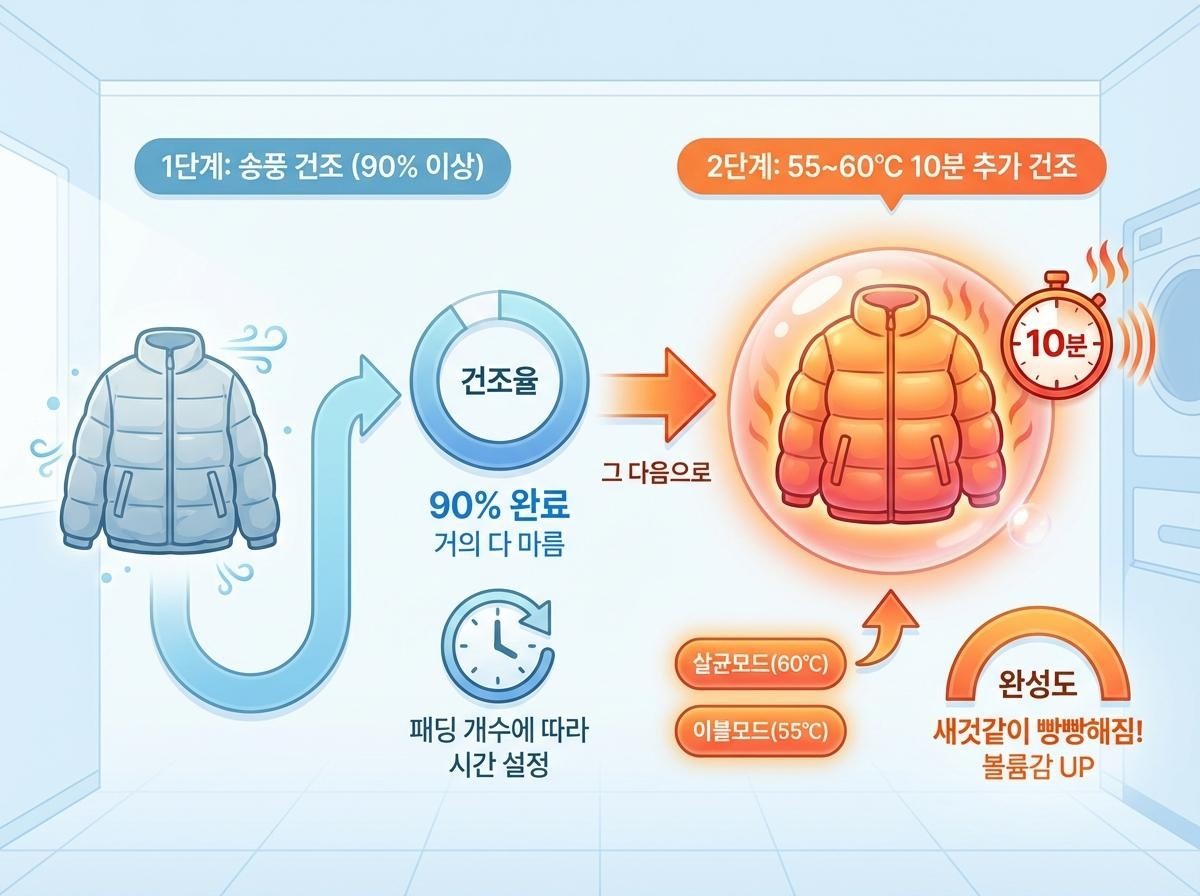 패딩이 90% 이상 말랐을 때가 볼륨감을 살리는 골든타임이다. 이때 60도의 '살균 모드'나 55도의 '이불 모드'로 설정해 약 10분간 짧게 건조기를 돌려주면, 죽어있던 충전재가 살아나며 새 옷처럼 빵빵한 외형을 되찾게 된다.
