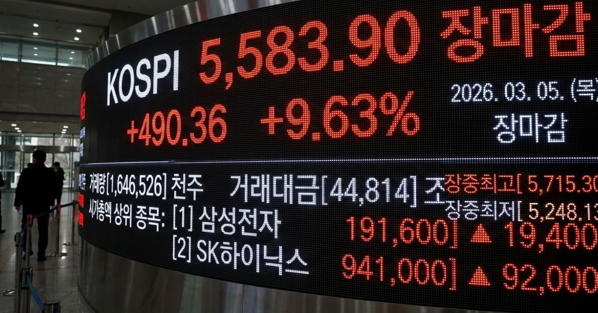 5일 코스피 지수가 대규모 개인 매수세 유입에 힘입어 9.63% 급등한 5580선으로 장을 마감했다. 삼성전자와 SK하이닉스 등 반도체 대형주들이 10%가 넘는 기록적인 상승률을 나타내며 전체 시장의 상승을 주도했다.