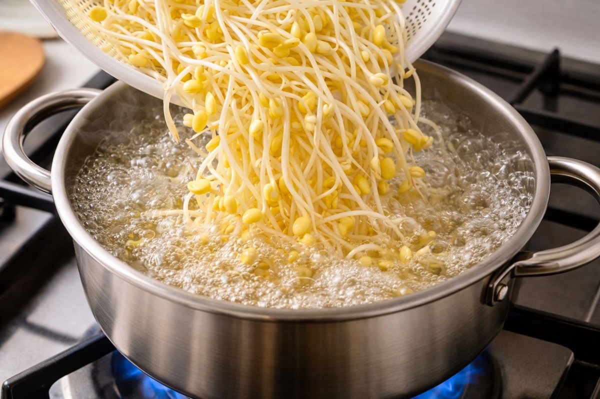 냄비에 물을 넉넉히 붓고 끓이기 시작한 뒤 먼저 콩나물을 넣는다. 콩나물은 오래 끓일수록 시원한 맛이 우러나기 때문에 국물이 끓기 시작하면 뚜껑을 덮지 않고 그대로 끓이는 것이 좋다. 여기에 다진 마늘을 넣고 국간장으로 간을 맞추면 기본적인 콩나물국의 국물 맛이 완성된다. 콩나물이 어느 정도 익어 투명해지고 국물에서 시원한 향이 올라오기 시작하면 다음 단계로 넘어가면 된다.