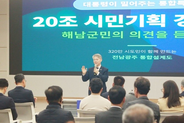 민형배 의원은 지난달 5일 순천을 시작으로 강진·장흥·고흥 권역과 광주 남구를 거쳐, 6일에는 해남군청 대회의실에서 해남·완도·진도 주민들과 함께하는 ‘20조 시민기획’ 경청투어를 진행했다고 밝혔다.