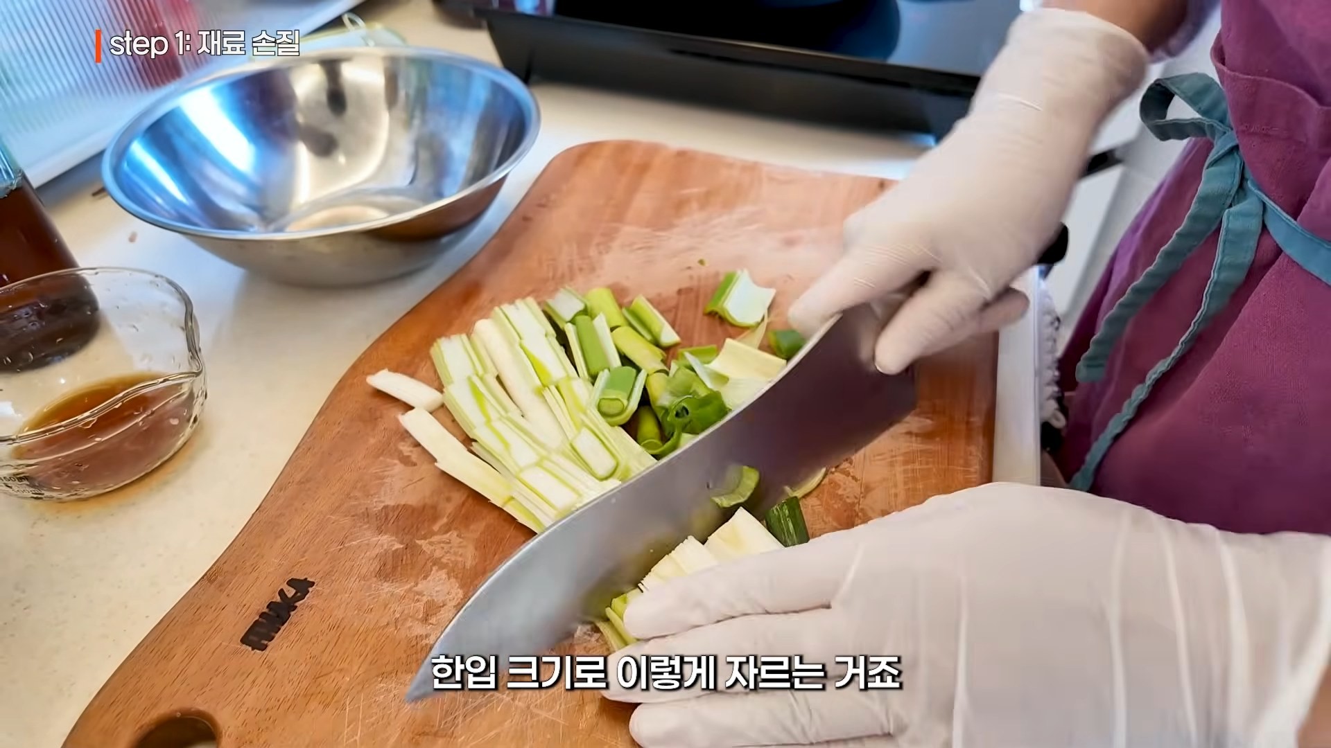 스팸이 익는 동안 대파무침을 만든다. 대파는 길게 반으로 가른 뒤 한 입 크기로 썰어 준비한다. 너무 굵게 썰기보다 적당한 길이로 잘라야 먹기 편하다.