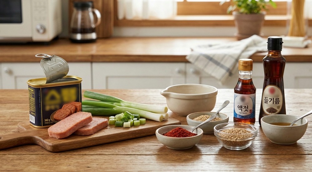 먼저 준비할 재료는 스팸과 대파다. 여기에 양념으로 고춧가루, 통깨, 멸치액젓 혹은 까나리액젓, 들기름이나 참기름 정도만 있으면 된다. 대부분의 가정에서 쉽게 구할 수 있는 재료다.