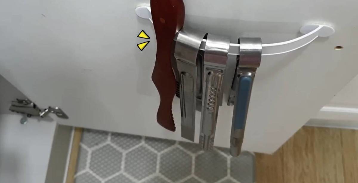 싱크대 문 안쪽에 플라스틱 손잡이를 부착하면 간단한 걸이 역할을 한다. 양면테이프나 글루건을 이용해 손잡이를 고정한 뒤 집게를 걸어두면 정리 공간이 만들어진다.