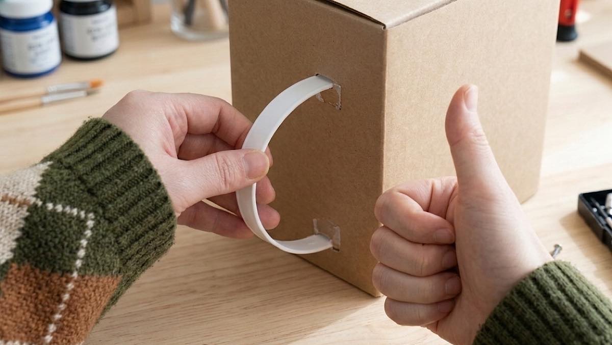 이럴 때 박스에 달린 플라스틱 손잡이를 활용할 수 있다. 바구니 양쪽에 손잡이가 들어갈 위치를 표시한 뒤 가위나 칼로 작은 구멍을 낸다. 이후 손잡이를 끼워 넣으면 별도의 접착제를 사용하지 않아도 고정이 가능하다.