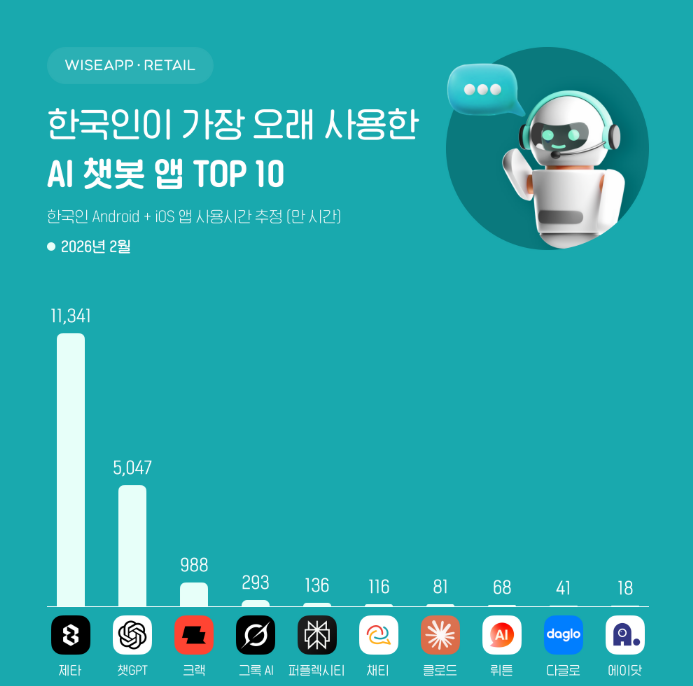 와이즈앱·리테일의 2026년 2월 조사 결과에 따르면 한국인이 가장 많이 사용하는 AI 챗봇은 챗GPT로 나타났으나 실제 몰입도를 나타내는 사용 시간 지표에서는 캐릭터형 AI 서비스가 기존 정보 검색형 서비스를 압도하며 시장의 판도 변화를 예고했다.