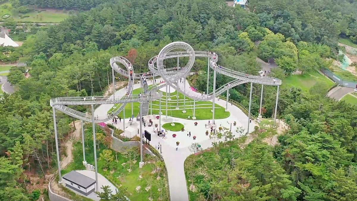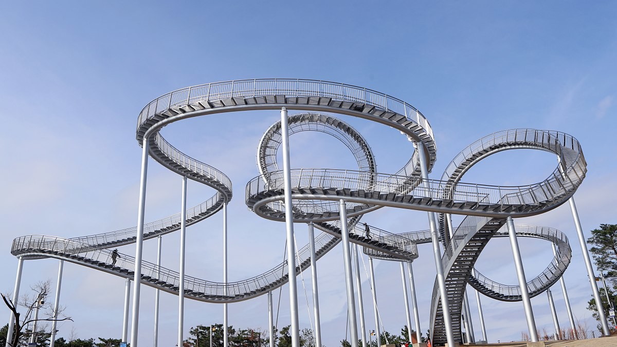 총길이 333m에 이르는 트랙에는 717개의 계단이 이어지며, 구조물 전체는 하늘을 향해 유연한 곡선을 그린다. 특히 트랙 중간에 위치한 360도 루프 구간은 구조상 직접 통과할 수 없도록 설계돼 있어, 양방향 계단을 따라 올라가 루프 직전에서 다시 내려오며 풍경을 감상하는 독특한 동선을 이룬다. 철로 구현한 부드러운 선은 구름이나 파도를 떠올리게 하며, 포항을 상징하는 철의 이미지를 현대적으로 풀어낸다.