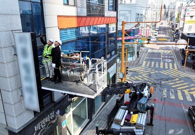 [위키트리 광주전남취재본부 노해섭 기자]10일 광주시 북구청 안전총괄과 광고물관리팀 직원과 전문가들이 학교 개학과 해빙기를 맞아 매곡동의 한 초등학교 어린이보호구역에서 어린이 보행안전을 위해 돌출간판 추락위험 예방 안전점검을 하고 있다.