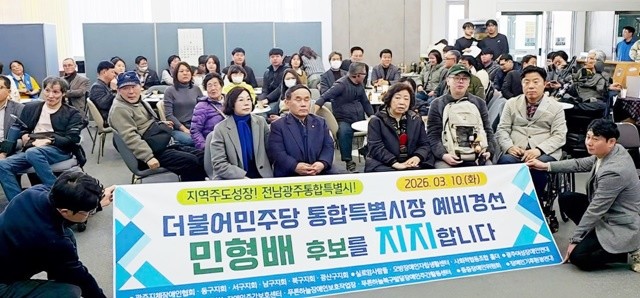 [위키트리 광주전남취재본부 노해섭 기자]더불어민주당의 ‘초대 전남광주통합특별시장’ 경선 레이스가 갈수록 치열해지는 가운데, 민형배 국회의원(광주 광산구을)이 지역 내 매머드급 장애인 단체들의 공식 지지를 이끌어내며 ‘복지 표심’을 선점하는 데 성공했다.