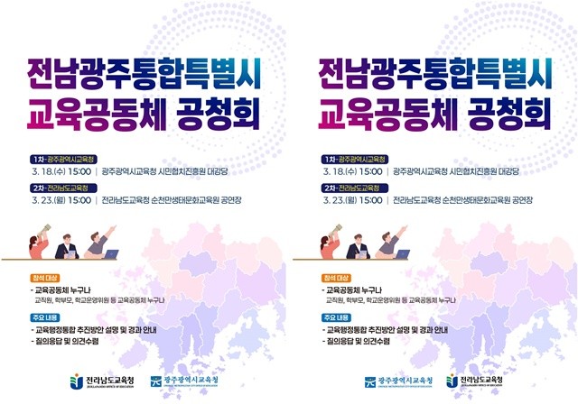 [위키트리 광주전남취재본부 노해섭 기자] 광주시교육청 ‘광주전남교육행정통합실무단’(이하 광주 실무준비단)과 전남도교육청 ‘전남광주교육행정통합추진단’(이하 전남 통합추진단)이 교육통합과 관련해 시도민의 이해를 돕기 위해 ‘전남광주통합특별시 교육공동체 공청회’를 개최한다.
