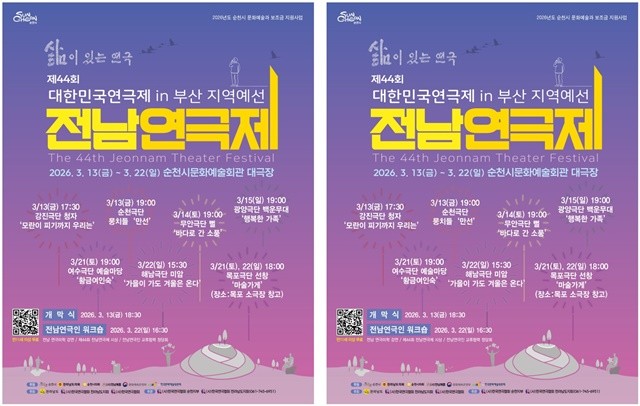 [위키트리 광주전남취재본부 노해섭 기자](사)한국연극협회 순천시지부는 ‘삶이 있는 연극’이라는 주제로 제44회 전남연극제를 오는 13일부터 22일까지 순천문화예술회관 대극장에서 개최한다고 밝혔다.