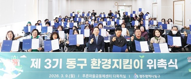 [위키트리 광주전남취재본부 노해섭 기자]광주시 동구는 지난 9일 푸른마을공동체센터에서 쾌적하고 건강한 지역 환경 조성을 위해 ‘제3기 동구 환경지킴이’ 위촉식을 개최하고 본격적인 활동에 나선다고 밝혔다.