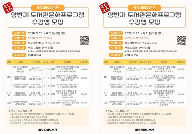 수강 신청은 3월 12일부터 목포시통합도서관 누리집을 통해 선착순으로 접수하며, 목포 및 인근 지역 주민이면 누구나 참여할 수 있다.