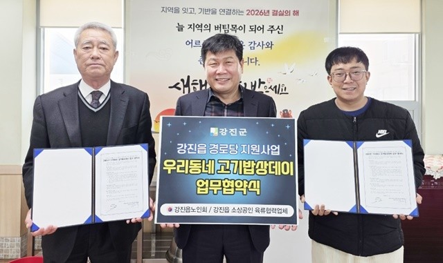 [위키트리 광주전남취재본부 노해섭 기자] 강진군 강진읍 노인회가 지난 4일, 2026년 ‘우리동네 고기밥상데이’ 사업의 원활한 추진을 위해 강진읍 소상공인 육류협력업체와 업무협약을 체결했다. 이날 협약식에는 강진 대한축산 김기열 대표가 참석해 안정적인 공급 및 배송 협력 방안 등을 논의했다.