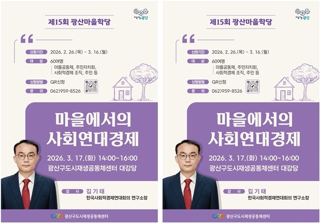 광산구도시재생공동체센터는 “오는 17일(화) 오후 2시 센터 대강당에서 주민자치회와 사회연대경제조직이 참여하는 ‘광산마을학당’을 개최한다”고 12일 밝혔다.